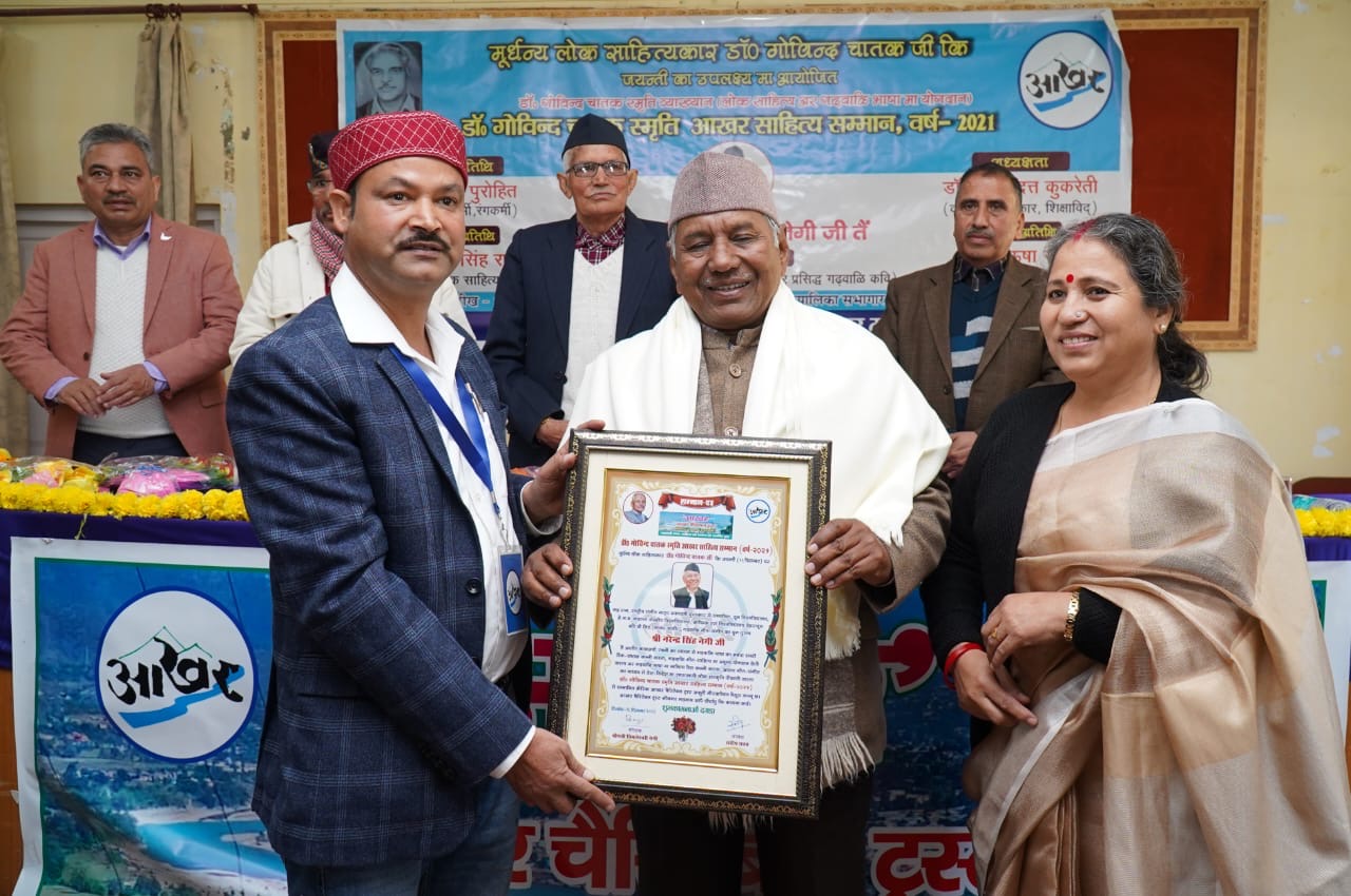 देहरादून। आखर चौरिटेबल ट्रस्ट द्वारा नगरपालिका सभागार श्रीनगर गढ़वाल में डॉ. गोविन्द चातक जयंती के अवसर पर विगत वर्षों की भांति डा. गोविन्द चातक स्मृति व्याख्यान एवं डॉ. गोविन्द चातक स्मृति आखर साहित्य सम्मान समारोह का आयोजन किया गया। गढ़वाली भाषा एवं गढ़वाली गीत साहित्य में अपने गीतों के माध्यम से अमूल्य योगदान देने हेतु वर्ष -2021का श्डॉ. गोविन्द चातक स्मृति आखर साहित्य सम्मान प्रसिद्ध लोकगायक नरेन्द्र सिंह नेगी को दिया गया। सम्मान स्वरूप उन्हें रुपए ग्यारह हजार (11,000/) की नकद धनराशि के साथ अंग वस्त्र , मान पत्र एवं विशेष आखर स्मृति चिन्ह भेंट किया गया। ग्यारह हजार रुपए की सम्मान राशि डॉ. चातक के परिवार की ओर से प्रदान की गई। परन्तु श्री नेगी ने सम्मान राशि आखर ट्रस्ट को ट्रस्ट के संचालन हेतु दान दी।