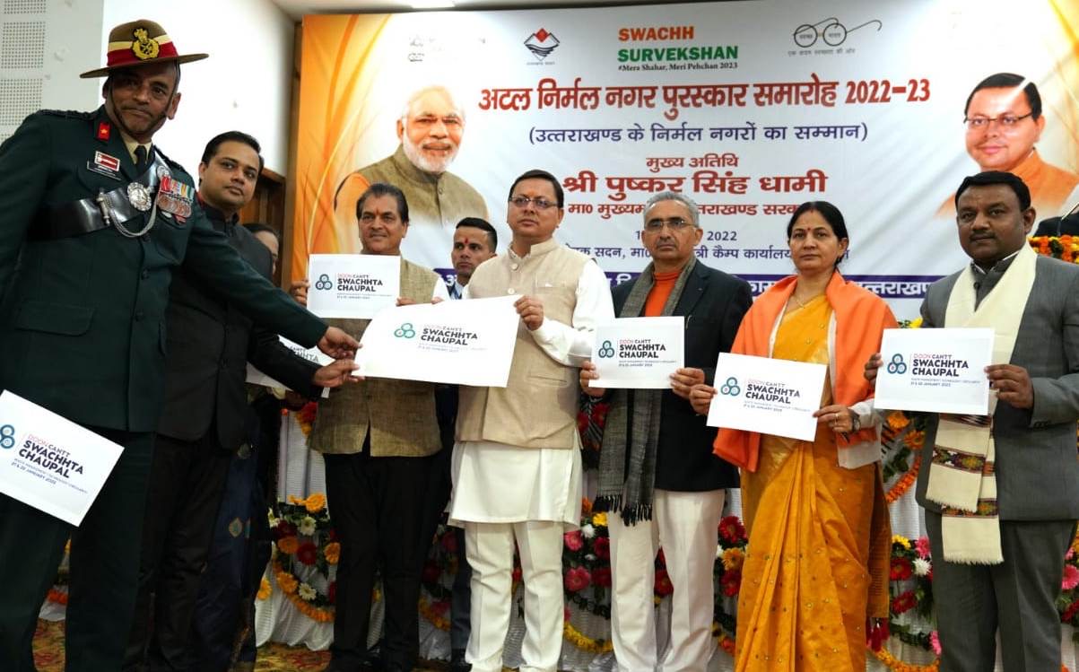 देहरादून। मुख्यमंत्री पुष्कर सिंह धामी ने सोमवार को मुख्यमंत्री आवास स्थित मुख्य सेवक सदन में स्वच्छ सर्वेक्षण-2022 में बेहतर प्रदर्शन करने वाले निर्मल नगरों को अटल निर्मल नगर पुरस्कार 2023 से सम्मानित किया। इस अवसर पर प्रदेश के 09 निकायों को अटल निर्मल पुरस्कार एवं राष्ट्रीय स्तर पर पुरस्कृत 05 निकायों को स्वच्छ गौरव सम्मान प्रदान किया गया। मुख्यमंत्री ने कार्यक्रम के दौरान दून कैंट स्वच्छता चौपाल का लोगो लाँच भी किया। मुख्यमंत्री पुष्कर सिंह धामी ने इस अवसर पर चार घोषणाएं की। उन्होंने कहा कि अटल निर्मल नगर पुरस्कार की धनराशि 01 करोड़ रूपये से बढ़ाकर 02 करोड़ रूपये की जायेगी, कैंट बोर्ड को भी इसमें सम्मिलित करने के लिए जो प्राविधान होंगे, उसके अनुसार किया जायेगा। प्रधानमंत्री आवास योजना शहरी के लाभार्थियों को भी आवास बन जाने के बाद सामान के लिए 05-05 हजार रूपये की प्रोत्साहन राशि दी जायेगी। केदारनाथ, बद्रीनाथ एवं गंगोत्री में यात्राकाल के दौरान कार्य करने वाले पर्यावरण मित्रों को भोजन एवं गरम वर्दी के लिए अतिरिक्त मानदेय दिया जायेगा। केन्द्रीयत सेवा के कर्मचारियों के पेंशन देयकों के भुगतान हेतु राज्य वित्त आयोग से 01 प्रतिशत की धनराशि उपलब्ध कराई जायेगी।