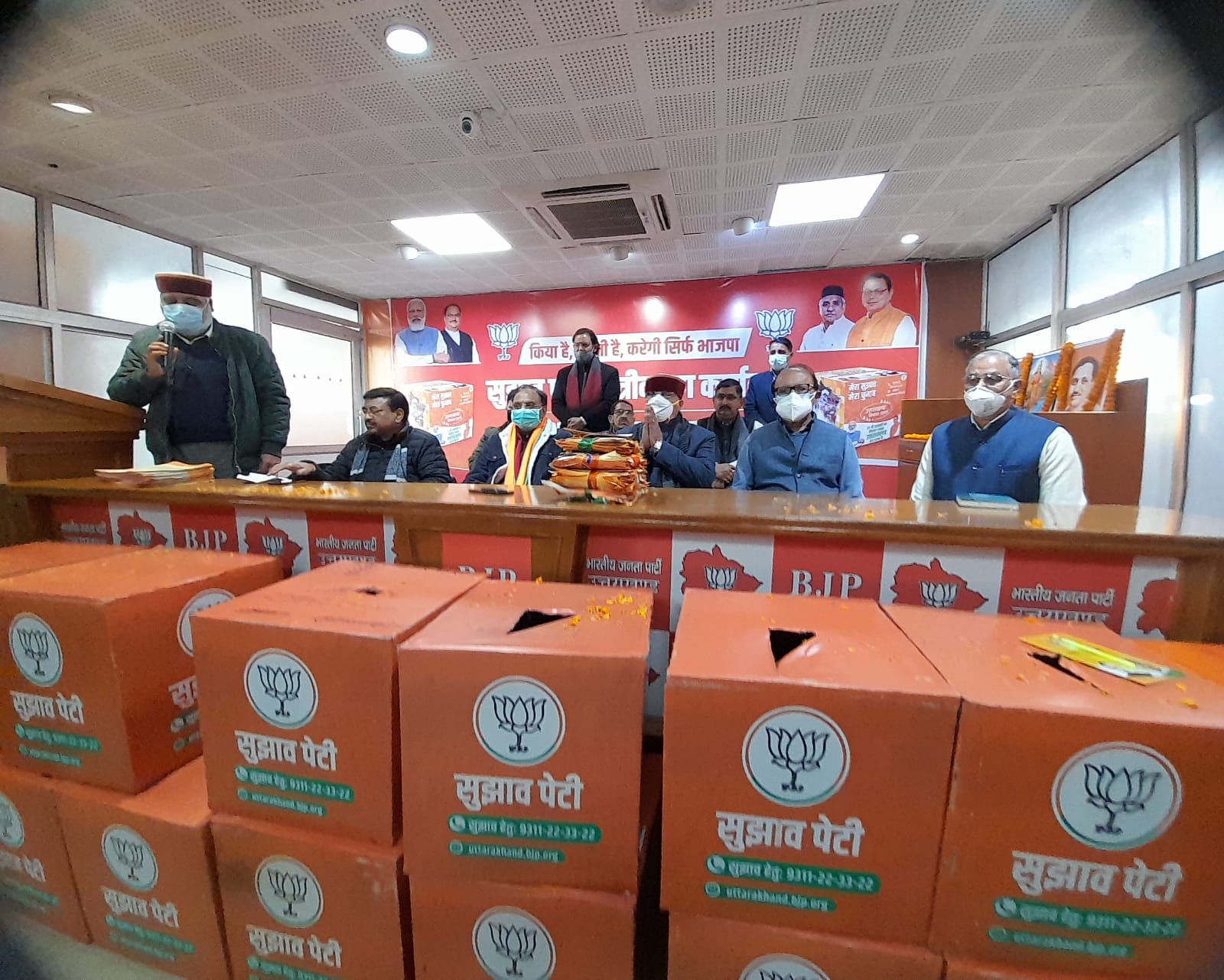 देहरादून। भाजपा ने अपने दृष्टि पत्र जनता के अनुरुप बनाने के क्रम में आज 70 विधानसभा क्षेत्रों में संचालित एलईडी रथों में लगी जन सुझाव पेटिका एकत्रीकरण अभियान पूर्ण होने पर प्रदेश मुख्यालय में कार्यक्रम आयोजित किया। इस अवसर पर पूर्व मुख्यमंत्री हरिद्वार सांसद व दृष्टि पत्र संयोजक डॉ रमेश पोखरियाल निशंक ने जानकारी देते हुए कहा कि इस अभियान में 120 सुझाव पेटिका और ऑनलाइन माध्यम से कुल 78610 सुझाव प्राप्त हुए हैं। उन्होंने बताया कि पार्टी ने आम लोगों की सहभागिता के अनुरुप दृष्टि पत्र बनाने का संकल्प लिया है। हमने अब तक जो कहा सदैव किया, इसीलिए प्रदेश के आखिरी छोर तक हमारे रथ गए और सुझाव लेकर आए। उन्होंने दावा किया कि भाजपा ही एक मात्र ऐसी पार्टी है जो आम जनता की राय को मद्देनजर रखते हुए अपना चुनावी संकल्प तैयार करती है।