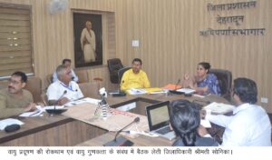 देहरादून। दिनांक 25 अगस्त 2022 (जि.सू.का), राष्ट्रीय स्वच्छ वायु कार्यक्रम के अन्तर्गत राज्य में देहरादून एवं ऋषिकेश में वायु प्रदूषण की रोकथाम एवं वायु गुणवत्ता के संबंध में जिलाधिकारी श्रीमती सोनिका की अध्यक्षता में ऋषिर्पणा सभागार कलेक्ट्रेट में बैठक आयोजित की गई।