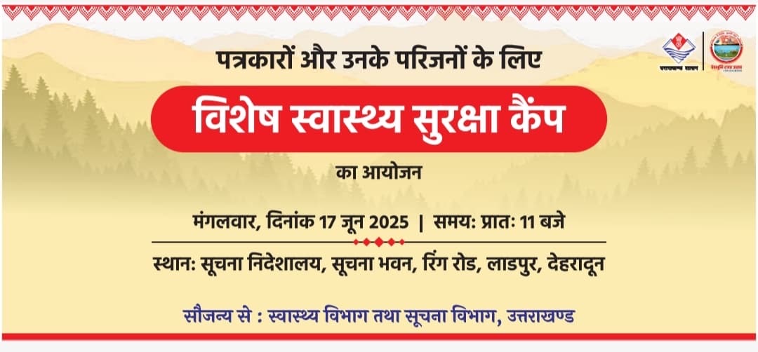 देहरादून 16 जून 2025: उत्तराखण्ड में पत्रकारों और उनके परिजनों के स्वास्थ्य की चिंता को लेकर राज्य सरकार बेहद गम्भीर है। मुख्यमंत्री पुष्कर सिंह धामी के निर्देश पर, मंगलवार 17 जून को सूचना निदेशालय, रिंग रोड, देहरादून में एक विशेष नि:शुल्क स्वास्थ्य सुरक्षा कैम्प का आयोजन किया जा रहा है।यह कैम्प स्वास्थ्य विभाग व सूचना विभाग के संयुक्त प्रयास से प्रातः 11 बजे से शुरू होगा।