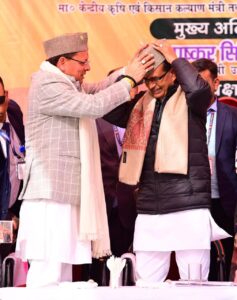 महिला सशक्तिकरण व ग्रामीण विकास शिवराज सिंह ने कहा कि केंद्रीय ग्रामीण विकास मंत्रालय की ओर से आज उत्तराखंड को 1700 करोड़ रु. की सड़कें भी मिली हैं। उत्तराखंड के पहाड़ों में गांव-गांव धामी जी ने सड़कों का जाल बिछाया है और जो गांव बचे हैं, उन्हें प्रधानमंत्री जी के नेतृत्व में हम जोड़ने का काम करेंगे। शिवराज सिंह ने कहा कि हमें बहनों की जिंदगी भी बदलना है। प्रधानमंत्री जी ने महिला सशक्तिकरण के लिए बहुत काम किया है, एक संकल्प है हमारा कि हर गरीब बहन लखपति बन जाएं। जीवित जागृत देवी अगर कोई है, तो वो हमारी बहनें हैं। बहनों की आंखों में आंसू न हो, उनके चेहरे पर मुस्कुराहट हो और इसलिए ’मुख्यमंत्री सशक्त बहना उत्सव योजना’ पुष्कर जी ने बनाई है। भारत सरकार की ओर से भी ’लखपति दीदी अभियान’ में हम कोई कसर नहीं छोड़ेंगे। 43 हजार दीदियां लखपति बन चुकी इस साल, स्वयं सहायता समूह भी यहां अच्छा काम कर रहे हैं, जिन्हें बढ़ावा देने में हम कोई कसर नहीं छोड़ेंगे। यूसीसी व किसान दिवस की सराहना- शिवराज सिंह ने उत्तराखंड को यूसीसी लागू करने वाला पहला राज्य होने पर बधाई दी, साथ ही कहा कि मुख्यमंत्री जी ने राज्य में बहुत अच्छा प्रयत्न प्रारंभ किया है कि हर ब्लॉक में किसान कल्याण के लिए हर माह किसान दिवस मनाया जाएगा। सरकार किसानों के द्वार जाएगी, सारे अधिकारी आएंगे व गांव में बैठकर किसानों की समस्या का समाधान करेंगे, किसानों को अब दफ्तरों के चक्कर लगाने की जरूरत नहीं है। उत्तराखंड की यह पहल बाकी राज्यों को प्रेरणा देगी।