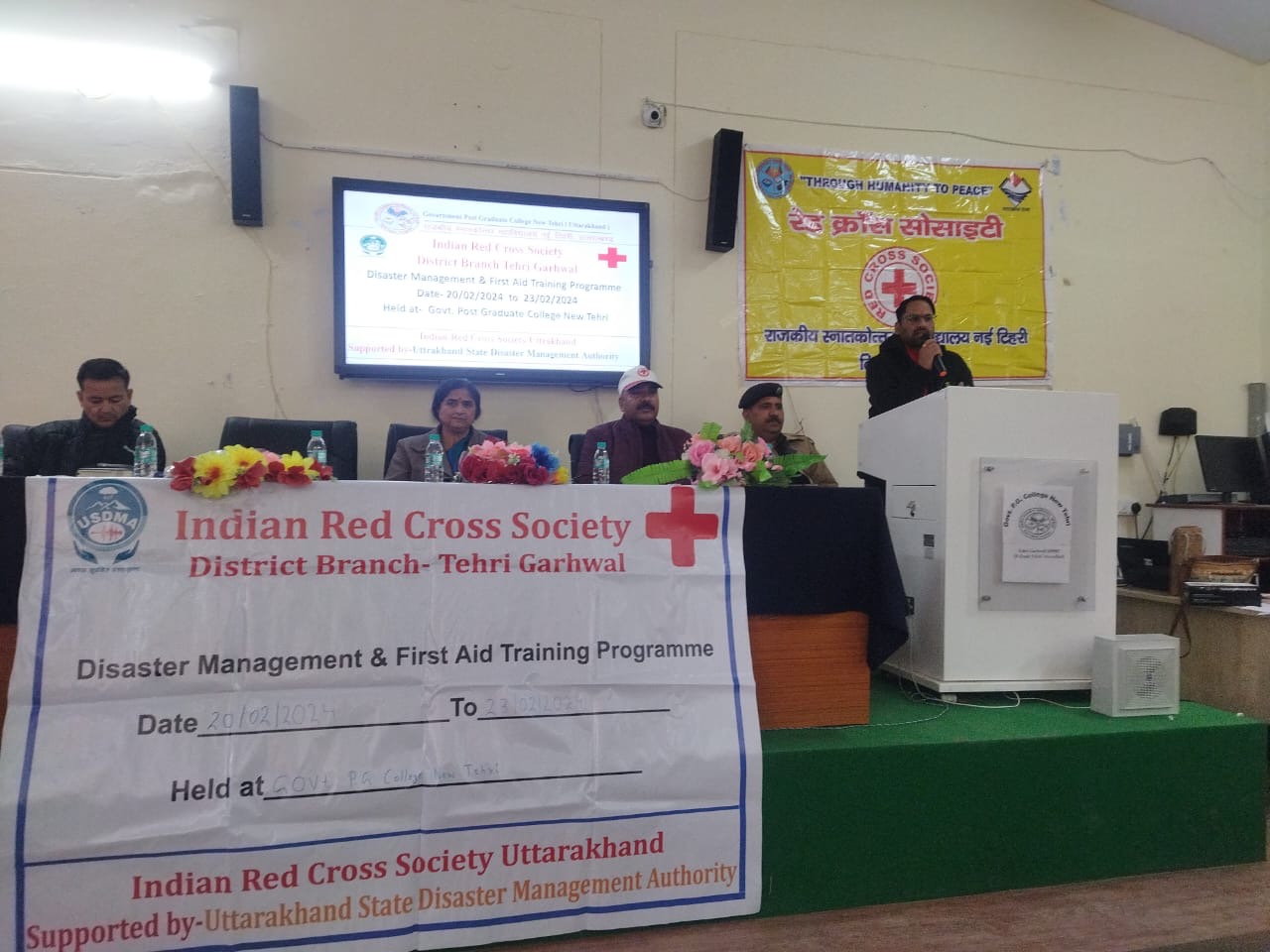 टिहरी। रेड क्रॉस सोसाईटी टिहरी द्वारा आयोजित आपदा प्रबंधन और प्राथमिक उपचार पर चार दिवसीय ट्रेनिग कार्यक्रम का शुभारम्भ जिला आपदा प्रबंधन अधिकारी बृजेश भट्ट, डॉ जितेंद्र भंडारी, और राजकीय स्नात्कोतर महाविद्यालय नई टिहरी की प्राचार्य प्रो पुष्पा नेगी के द्वारा  संयुक्त रूप से राजकीय स्नात्कोतर महाविद्यालय नई टिहरी के सभागार में दीप प्रज्ज्वलित कर किया गया। जिसमें आपदा प्रबंधन विभाग, स्वास्थ्य विभाग, होमो पैथिक चिकित्सा विभाग, अग्नि शमन और पुलिस विभाग द्वारा संयुक्त रूप से  रेड क्रॉस शोसाईटी के साथ सहयोग किया जा रहा है।