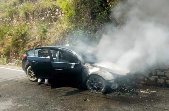 नैनीताल। हल्द्वानी से भवाली की ओर एक कार में आमडाली भीमताल के पास अचानक आग लग गई। बताया जा रहा हे कि कार में 4 लोग सवार थे। घटना की जानकारी मिलते ही मौके पर पहुंची भीमताल पुलिस एवं फायर यूनिट ने पानी डालकर आज बुझाया फिलहाल कार सवार दो पुरुष 2 महिला आग लगते ही कार से बाहर निकल गए थे। इसलिए बड़ा हादसा होने से बच गया।