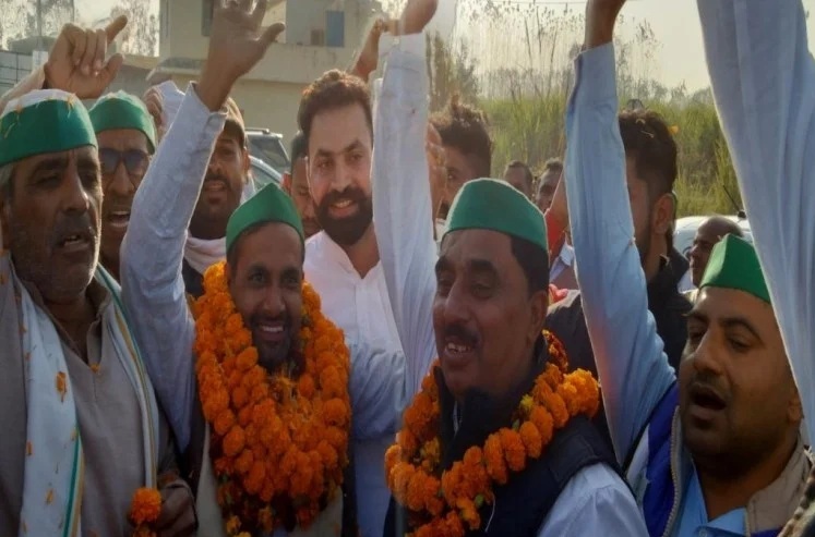 नारसन बॉर्डर पहुंचे क्षेत्रीय किसानों का फूल मालाओं से स्वागत किया गया