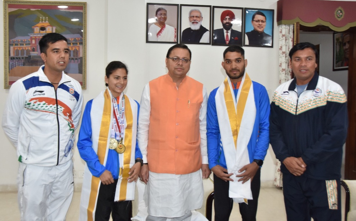देहरादून। मुख्यमंत्री पुष्कर सिंह धामी से मंगलवार को मुख्यमंत्री आवास में 37वें नेशनल जूनियर एथलेटिक्स चौंपियनशिप की 10 कि.मी. रेस वाक में नेशनल रिकॉर्ड के साथ स्वर्ण पदक जीतने वाली मानसी नेगी और एथलीट सूरज पंवार ने भेंट की। मुख्यमंत्री ने दोनों एथिलीट को एक-एक लाख रूपये की धनराशि देने की घोषणा की।