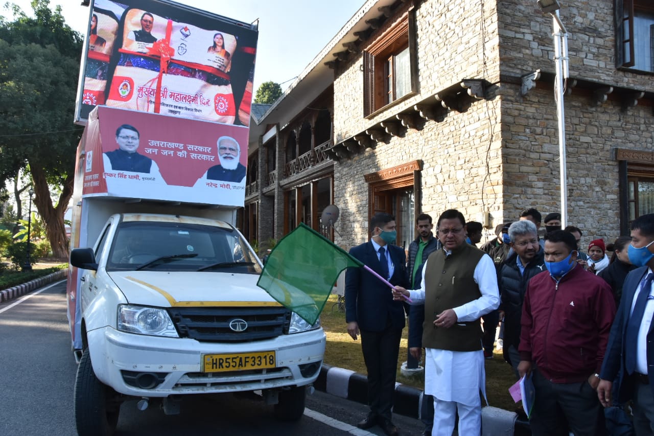 देहरादून। मुख्यमंत्री पुष्कर सिंह धामी ने बुधवार को मुख्यमंत्री आवास से सरकार की लोक कल्याणकारी योजनाओं एवं नीतियों के व्यापक प्रचार-प्रसार के लिए विकास रथ/एलईडी वाहनों का फ्लैग ऑफ किया। सरकार की योजनाओं को जन-जन तक पहुंचाने के लिए प्रदेश के 300 प्रमुख स्थानों पर नुकड़ नाटकों एवं एलईडी द्वारा फिल्मों के माध्यम से प्रचार किया जाएगा। सभी जनपदों हेतु 07 रूट तय किए गए हैं।