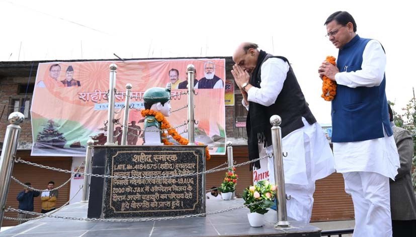 पिथौरागढ़/देहरादून। केंद्रीय रक्षा मंत्री राजनाथ सिंह एवं मुख्यमंत्री पुष्कर सिंह धामी ने शनिवार को मणेगांव तिराहा, पिथौरागढ़ में कारगिल युद्ध के दौरान शहीद हुए हवलदार कुंदन सिंह खड़ायत की प्रतिमा पर पुष्पांजलि अर्पित कर श्रद्धांजलि दी। केंद्रीय रक्षा मंत्री एवं मुख्यमंत्री ने शहीद के परिवार जनों से मुलाकात कर हर संभव मदद का आश्वासन दिया। इस दौरान केंद्रीय रक्षा राज्य मंत्री अजय भट्ट, सांसद अजय टम्टा, कैबिनेट मंत्री गणेश जोशी, कैबिनेट मंत्री बिशन सिंह चुफाल, भाजपा प्रदेश अध्यक्ष मदन कौशिक भी मौजूद रहे।