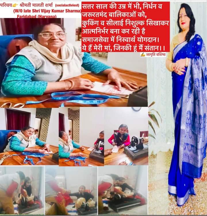 जीवन की ढलती शाम , सत्तर साल की वृद्धा कहूं या सत्तर साल की युवा। घर में नौकर चाकर, बहू बेटे , पोती पोता सब है, पर आज भी भोर वेला में उठना, स्नान आदि नित्य कर्म उपरांत, भजन पूजन कर, उन्हें बेहद पसंद हैं परिवार के लिए भोजन अपने हाथो से बनाना। विद्यार्थी जीवन में होमसाइंस उनका पसंदीदा सब्जेक्ट हुआ करती थी। सीलाई कड़ाई में डिप्लोमा होल्डर। कभी युवावस्था में, उत्तरप्रदेश के गाजियाबाद में जन्मी और पंजाब के संगरूर में शादी के बाद,पटियाला में खुदका स्कूल खोल कर अपनी प्रतिभा का लोहा मनवाने वाली इन शक्ति स्वरूपा का जीवन संघर्षों की वो कहानी है जो स्वयं में एक प्रेरणा है कि एक महिला साहस, सहनशक्ति व अनगिनत खूबियों से लबरेज संसार में ईश्वर की सर्वश्रेष्ठ रचना है। कम उम्र में विवाह होने पर भी अपनी शिक्षा व हुनर को आयाम ही नहीं दिए ,अपितु अपनी ज्ञान गंगा को एक आदर्श शिक्षिका बन न जाने कितनी शिष्याओ को आत्मनिर्भर बनाया। नो बार ऑबोर्शन , आर्थिक व मानसिक चुनौतियां, संयुक्त परिवार के तानेबाने, न जाने कितने तूफ़ानों से गुज़र कर भी कुछ नहीं बदला तो वो था इनका आत्मविश्वास, जनसेवा का निस्वार्थ जजबा, व अनुशासित परंतु हसमुख स्वभाव। 2017 में ब्रेन हैमरेज से अपने जीवनसाथी को खोने के बाद , लगने लगा था कि शायद पुनः नहीं देख पाएंगे ये जिंदादिली इनमें,परंतु खुदको समाजसेवा में संलग्न कर, अपने मनुष्य जीवन को सार्थक कर न केवल बनी है ये परिवार के लिए एक आदर्श व प्रेरणा अपितु मै गौरवान्वित हूं कि मैंने एक ऐसी मां की कोख से जन्म लिया है जो स्वयं में एक पावन पुनीत प्रेरक ग्रन्थ है। कोमल है कमज़ोर नहीं शक्ति है कल्याणी है ये मेरी मां है ये प्रेरणा मेरी, ये मेरी प्रथम गुरु, वरदानी है।