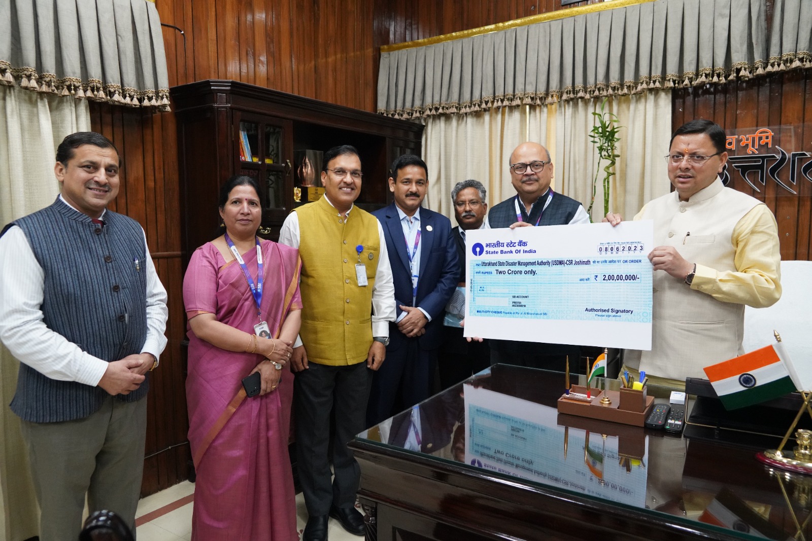 देहरादून। जोशीमठ में भू-धंसाव वाले क्षेत्र से विस्थापित लोगों के राहत और पुनर्वास के लिए भारतीय स्टेट बैंक द्वारा गुरूवार को उत्तराखण्ड राज्य आपदा राहत कोष में 02 करोड़ रूपये की आर्थिक सहायता प्रदान की गई। मुख्यमंत्री पुष्कर सिंह धामी से मुख्यमंत्री कैम्प कार्यालय में भारतीय स्टेट बैंक, नई दिल्ली मण्डल के मुख्य महाप्रबंधक कल्पेश कृ. अवासिया ने भेंट कर 02 करोड़ रूपये का चेक सौंपा।