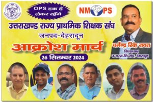 उत्तराखंड (देहरादून) वीरवार, 26 सितम्बर 2024 NMOPS की राष्ट्रीय कार्यकारिणी के अहवाहन पर उत्तराखंड राज्य प्राथमिक शिक्षक संघ, देहरादून के जिलाध्यक्ष धर्मेन्द्र सिंह रावत के नेतृत्व में जनपद के शिक्षको द्वारा जनपद में चल रही प्रारंभिक जनपद स्तरीय क्रीड़ा एवम सांस्कृतिक प्रतियोगिता के भोजन अवकाश के समय पर पुरानी पेंशन बहाली हेतु जन आक्रोश मार्च का आयोजन किया गया ।