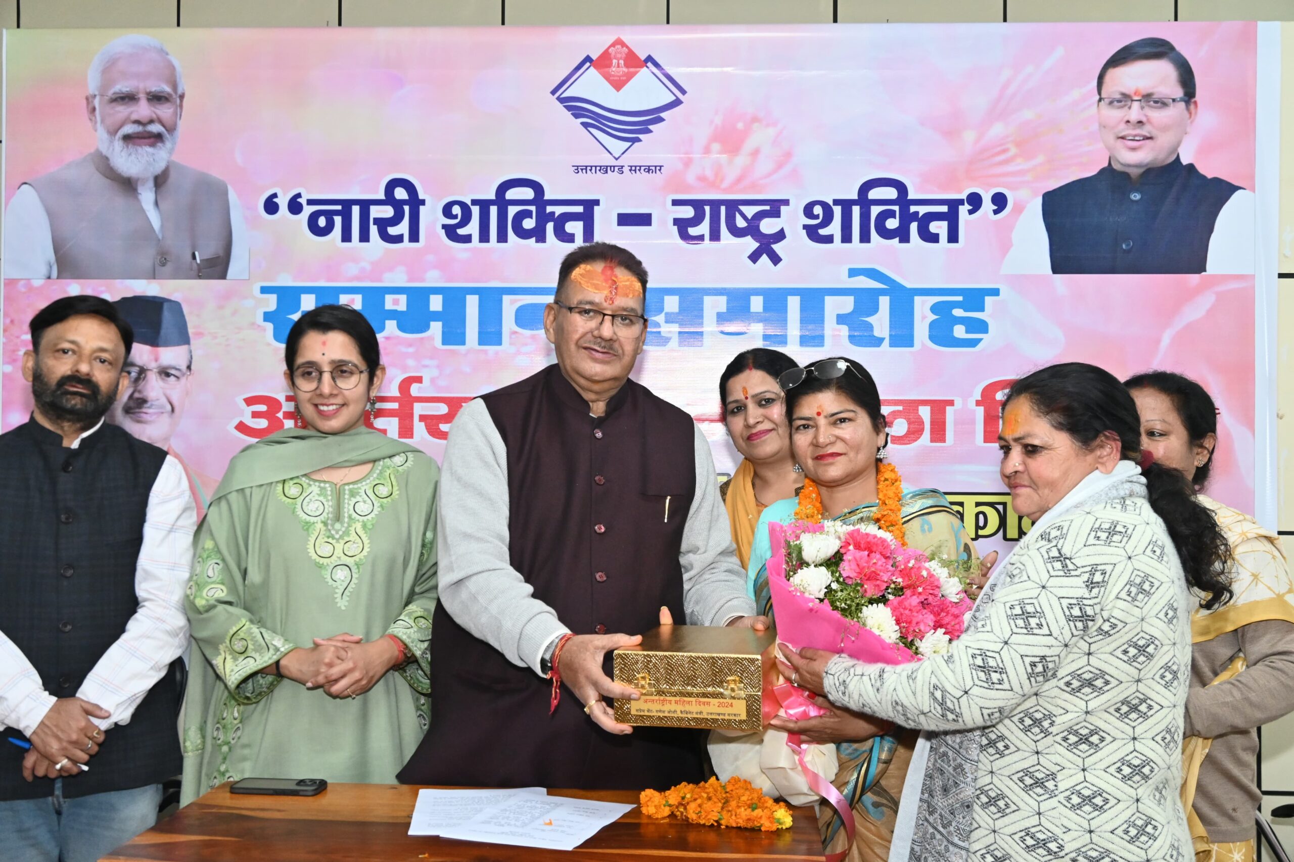 प्रदेश के कृषि एवं कृषक कल्याण मंत्री गणेश जोशी ने अर्न्तराष्टीय महिला दिवस के उपलक्ष में आज हाथीबड़कला स्थित कैंप कार्यालय में नारी शक्ति-राष्ट शक्ति एवं सम्मान समारोह कार्यक्रम का आयोजन किया गया। कार्यक्रम के दौरान कैबिनेट मंत्री गणेश जोशी ने अर्न्तराष्टीय महिला दिवस के अवसर पर अपने अपने क्षेत्र में उत्कृष्ट कार्य करने वाली 06 महिलाओं को स्मृति चिन्ह और पुष्प गुच्छ देकर सम्मानित किया गया। कार्यक्रम में उपस्थित कई वक्ताओं ने समाज में महिलाओं की भागीदारी पर प्रकाश डाला।