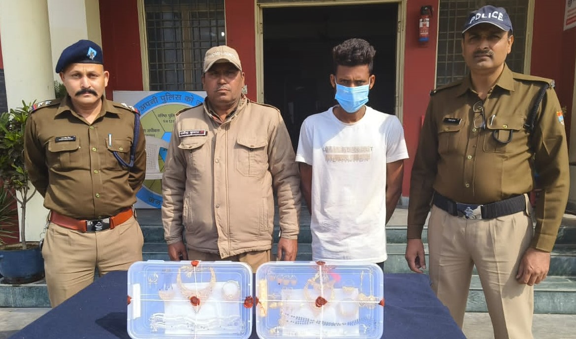 देहरादून। पुलिस ने चोरी की घटना का खुलासा करते हुए 10 लाख के गहनों के साथ शातिर चोर को गिरफ्तार किया है। वादी सुरेन्दर सिंह रावत पुत्र बुद्दी सिंह निवासी तिलक विहार निगम रोड थाना सेलाकुई में लिखित तहरीर दी कि वह 25 अक्टूबर को वह कुछ दिनों के लिये अपनी रिश्तेदारी में गये थे, जब वापस आये तो अज्ञात चोरों ने उनके घर का ताला तोडकर घर के अन्दर रखा सामान व ज्वैलरी चोरी कर ली थी। लिखित तहरीर के आधार पर थाना सेलाकुई में मुकदमा पंजीकृत किया गया।