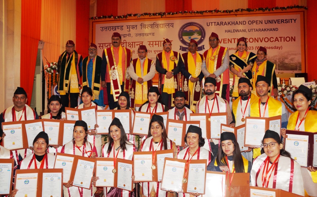 मुख्यमंत्री पुष्कर सिंह धामी ने उत्तराखण्ड मुक्त विश्वविद्यालय के सप्तम दीक्षांत समारोह में वर्चुअल रूप से प्रतिभाग करते हुए उपाधि प्राप्त करने वाले सभी विद्यार्थियों को बधाई दी। उन्होंने कहा कि उच्च शिक्षा के माध्यम से उच्च कोटि का व्यक्तित्व निर्माण करने में उत्तराखण्ड विश्वविद्यालय महत्वपूर्ण भूमिका निभा रहा है। विश्वविद्यालय द्वारा विद्यार्थियों की अन्तर्निहित क्षमता एवं उनके व्यक्तित्व विकास के लिए सराहनीय कार्य किया जा रहा है। विश्वविद्यालय को अपने पहले ही प्रयास में नैक द्वारा मूल्यांकन में बी ग्रेड प्राप्त हुआ वहीं दिव्यांगों के क्षेत्र में विशिष्ट कार्यों के लिये राष्ट्रपति पुरस्कार से भी सम्मानित किया गया। यह उपलब्धियां विश्वविद्यालय के कुशल नेतृत्व और शैक्षणिक एवं गैर शैक्षणिक कार्मिकों के अथक परिश्रम का प्रतिफल है। उन्होंने आशा व्यक्त की कि जो विद्यार्थी आज यहा से दीक्षा ले रहे हैं, अब वे जिस भी कार्य क्षेत्र में जायेंगे उस क्षेत्र में अपनी प्रतिभाओं से समाज को नेतृत्व प्रदान करेंगे। सांसद अजय भट्ट में सभी को शुभकामनाएं देते हुए उनके उज्ज्वल भविष्य की कामना की। इस अवसर पर  शिक्षा मंत्री ने कहा कि जल्द ही उत्तराखंड राज्य देश का पहला राज्य होगा जहां एक परीक्षा, चुनाव, दीक्षांत , शैक्षिक कैलेंडर व गणवेष होगा। कार्यक्रम का संचालन कुलसचिव प्रो0 रश्मि पन्त ने किया। इस अवसर पर विश्विद्यालय के कुलसचिव प्रो ओम प्रकाश, जिलाध्यक्ष प्रताप बिष्ट,  जिला पंचायत अध्यक्ष बेला तोलिया, मेयर डॉ जोगिंदर पाल सिंह रौतेला, विधायक डॉ मोहन सिंह बिष्ट, प्रोफेसर डॉ भानू प्रकाश जोशी, प्राचार्य डॉ अरुण जोशी, डिप्टी रजिस्ट्रार विमल कुमार,डॉ राकेश रयाल, बृजेश बनकोटी, महामंत्री राजेन्द्र बिष्ट, सुरेश भट्ट, अजय राजौर, दिनेश आर्य, प्रकाश हरबोला, डॉ बहादुर सिंह बिष्ट, शंशाक रावत,कुंदन लटवाल, सहित अन्य विश्वविद्यालय के कुलपति उपस्थित थे।